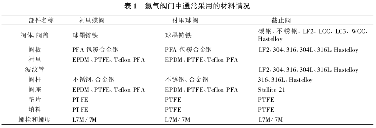 依据国外用于氯气管路上的阀门材料要求 ,表1 列出了氯气阀门中通常采用的材料及其特性。